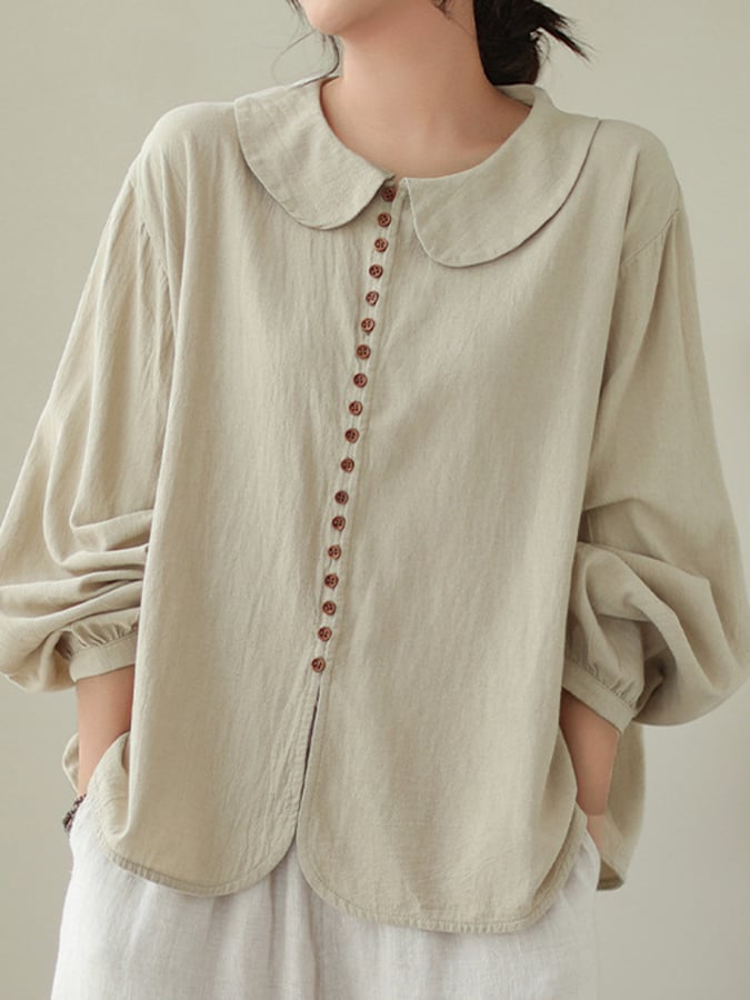 Women's Cotton Art Loose Button-Up Peter Pan Collar Long Sleeve Shirt