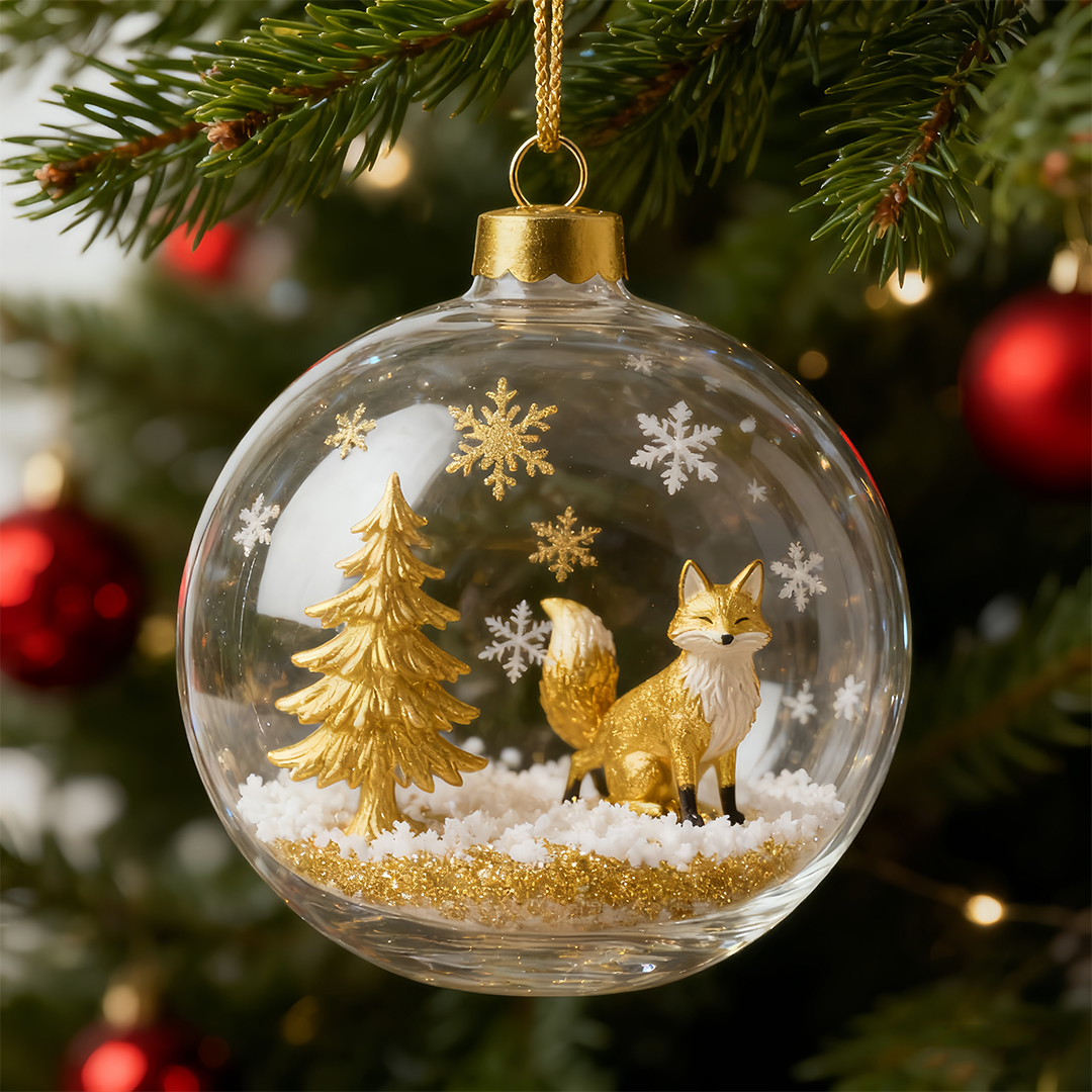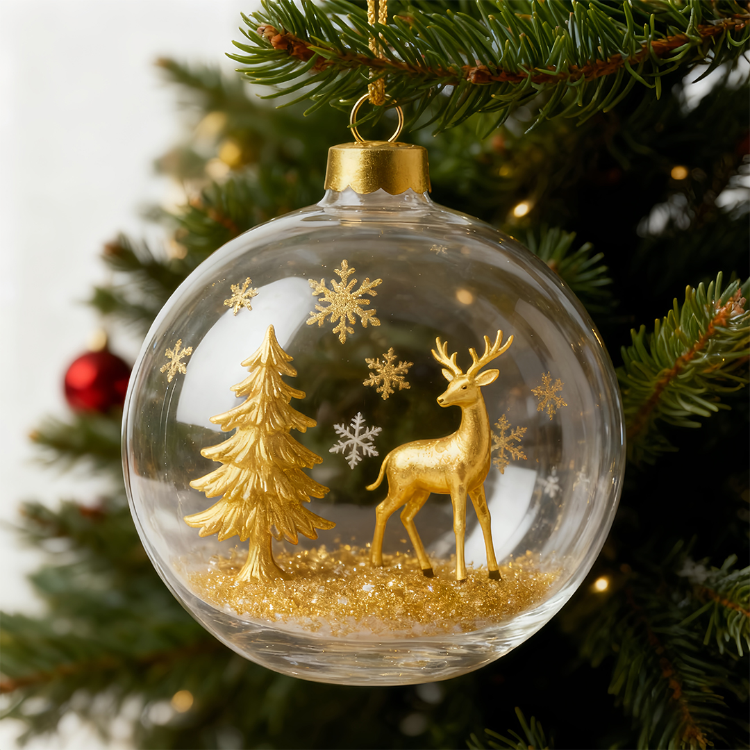 Our Golden Forest Christmas Ball Ornament captures the serene beauty of the forest—graceful reindeer stroll among evergreen trees, surrounded by shimmering golden snowflakes, encased in a crystal-clear glass ball.