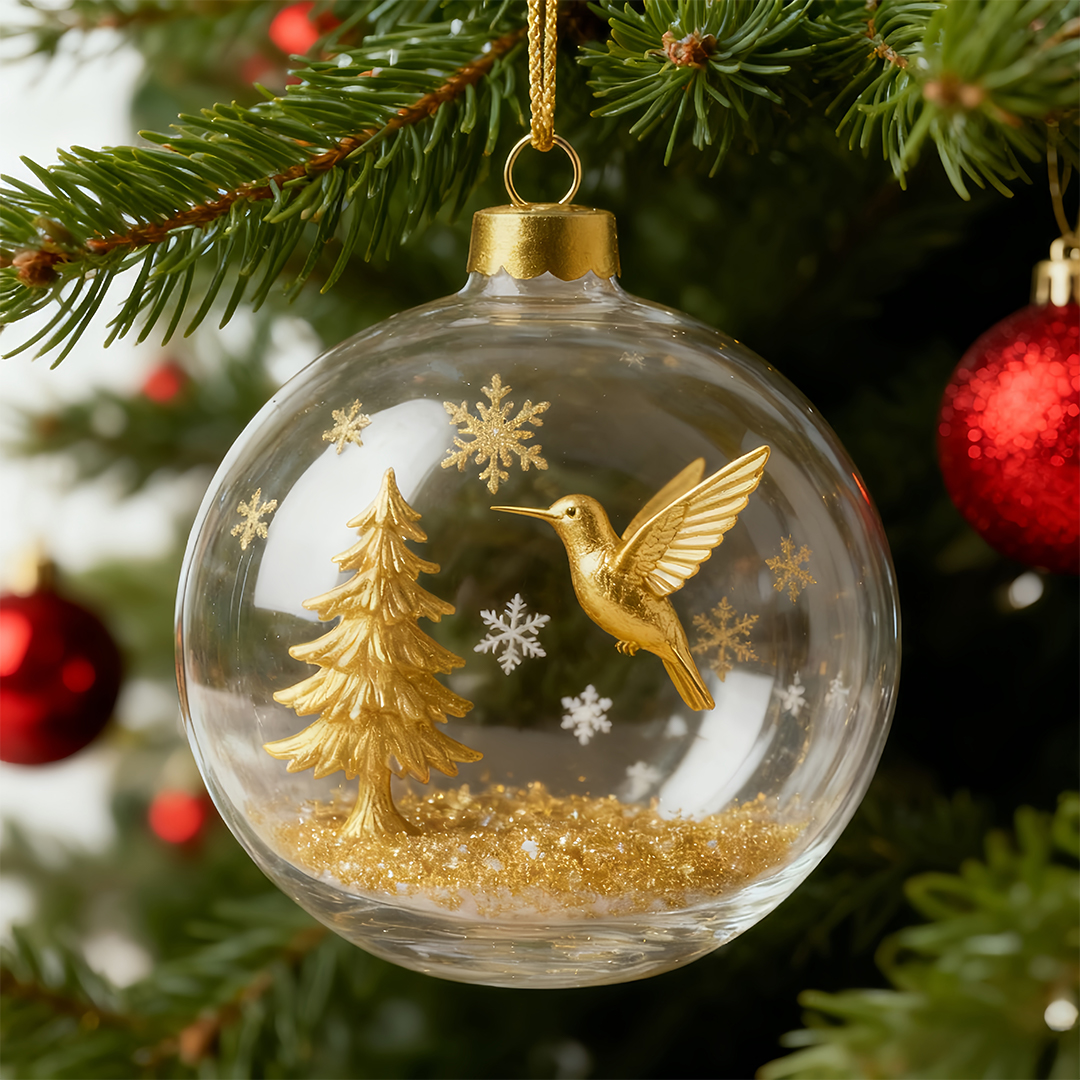 Within a crystal-clear glass sphere, a lifelike hummingbird hovers mid-air, bringing surprise and delight to your holiday season.