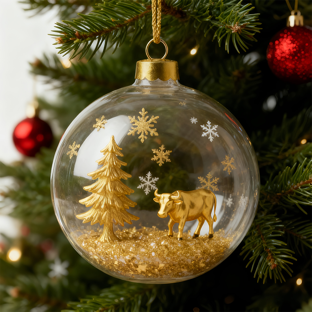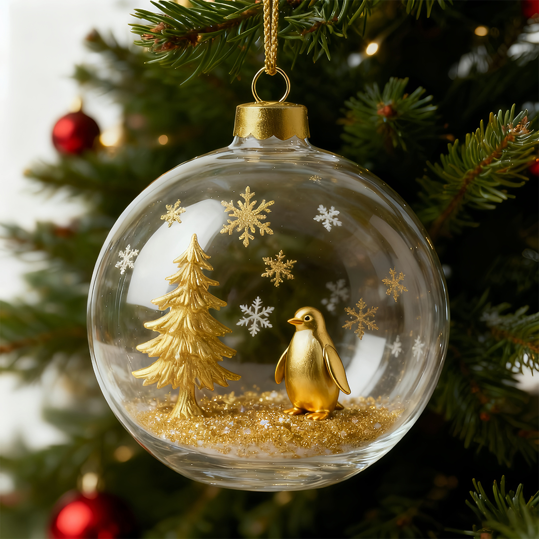 Festive Sparkle: Fine gold flakes and snow crystals inside add movement and warmth under twinkling lights.