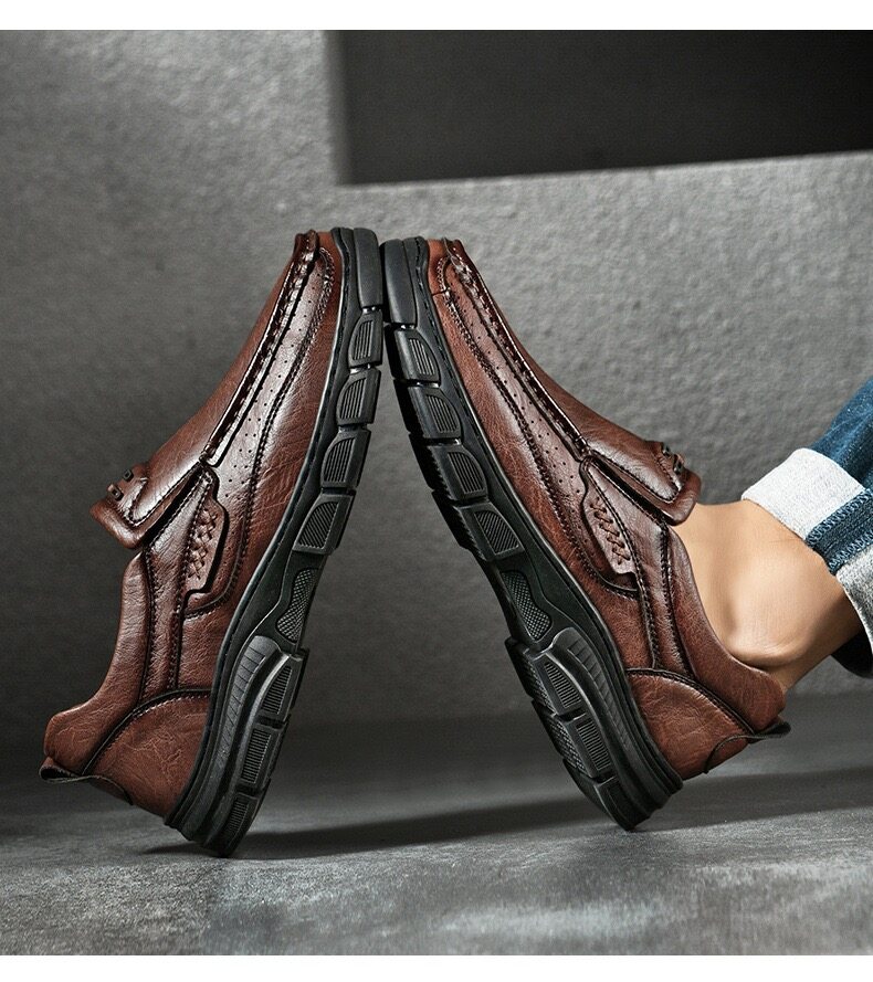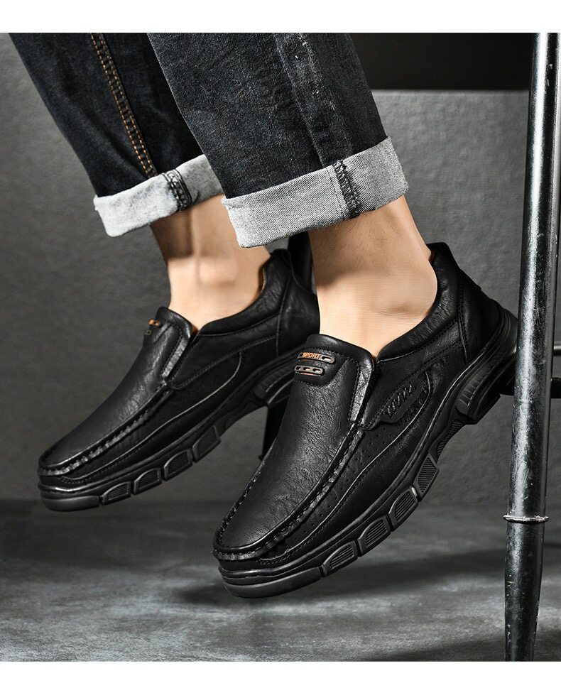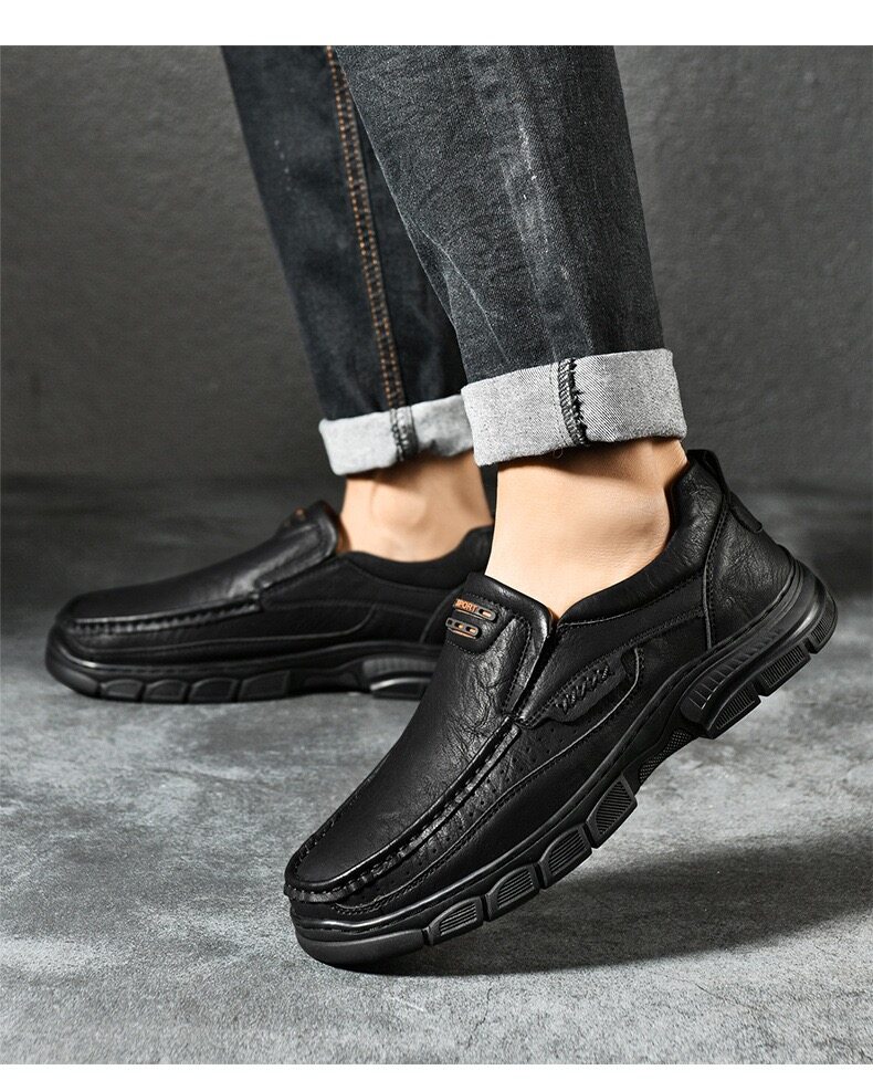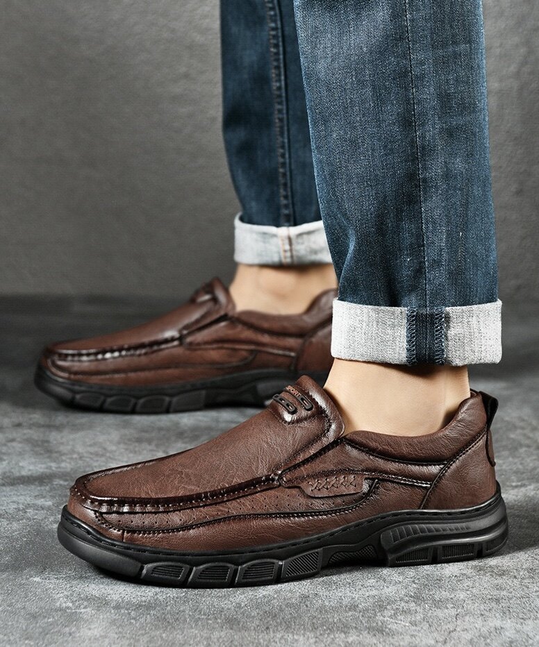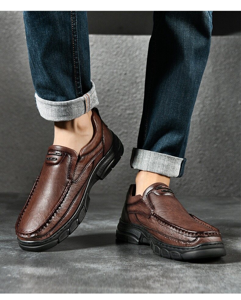 Crafted with a cow leather upper and breathable perforated design, these slip-on shoes keep your feet cool and dry. The flexible elastic opening ensures an easy fit while providing a secure, comfortable feel. The durable rubber outsole offers excellent cushioning, absorbing shock with each step. Paired with breathable, shock-absorbing insoles, they provide all-day comfort and support, making them perfect for work, travel, or even as home slippers. Ideal for any occasion or terrain.