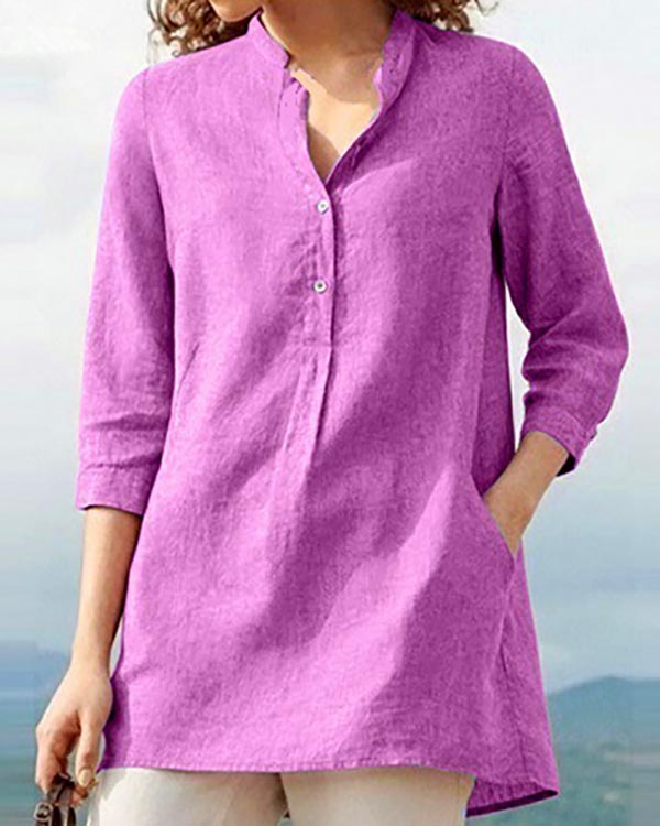 Solid Color Stand Collar Linen Casual Pullover Shirt Top